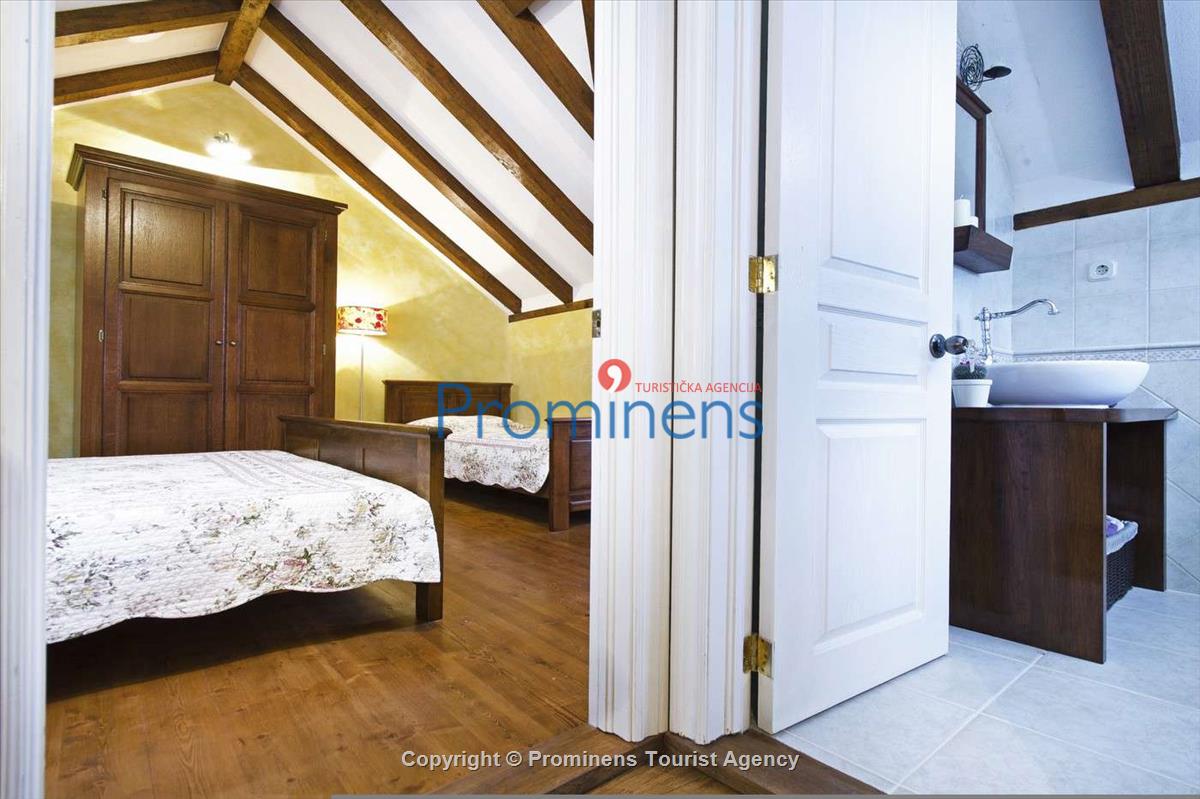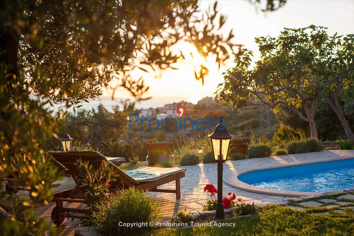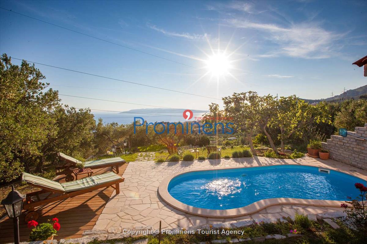Das Ferienhaus Ela mit Meerblick liegt oberhalb der Stadt Makarska im malerischen Dorf Puharići in Kroatien. Das Haus bietet ein komfortables Wohnzimmer mit einer voll ausgestatteten Küche, TV/SAT und Internet. Im Esszimmer finden Sie einen gemütlichen Sofa-Bereich. Auf der ersten Etage befindet sich ein Badezimmer mit Dusche sowie ein Schlafzimmer mit einem Doppelbett und einem Einzelbett. Vor dem Haus erwartet Sie ein Grillplatz und eine überdachte Pergola mit Gartenmöbeln, ideal zum Entspannen und Genießen. Der Swimmingpool (5,5m x 2,5m) sorgt für erfrischende Abkühlung an warmen Tagen. Das Ferienhaus Ela ist der perfekte Ort für einen entspannten Familienurlaub. Umgeben von Olivenbäumen bietet es einen herrlichen Ausblick auf das Meer, die Adria und die umliegenden Inseln in Dalmatien. Buchen Sie jetzt Ihre Ferienunterkunft bei Prominens Makarska und erleben Sie unvergessliche Urlaubstage.